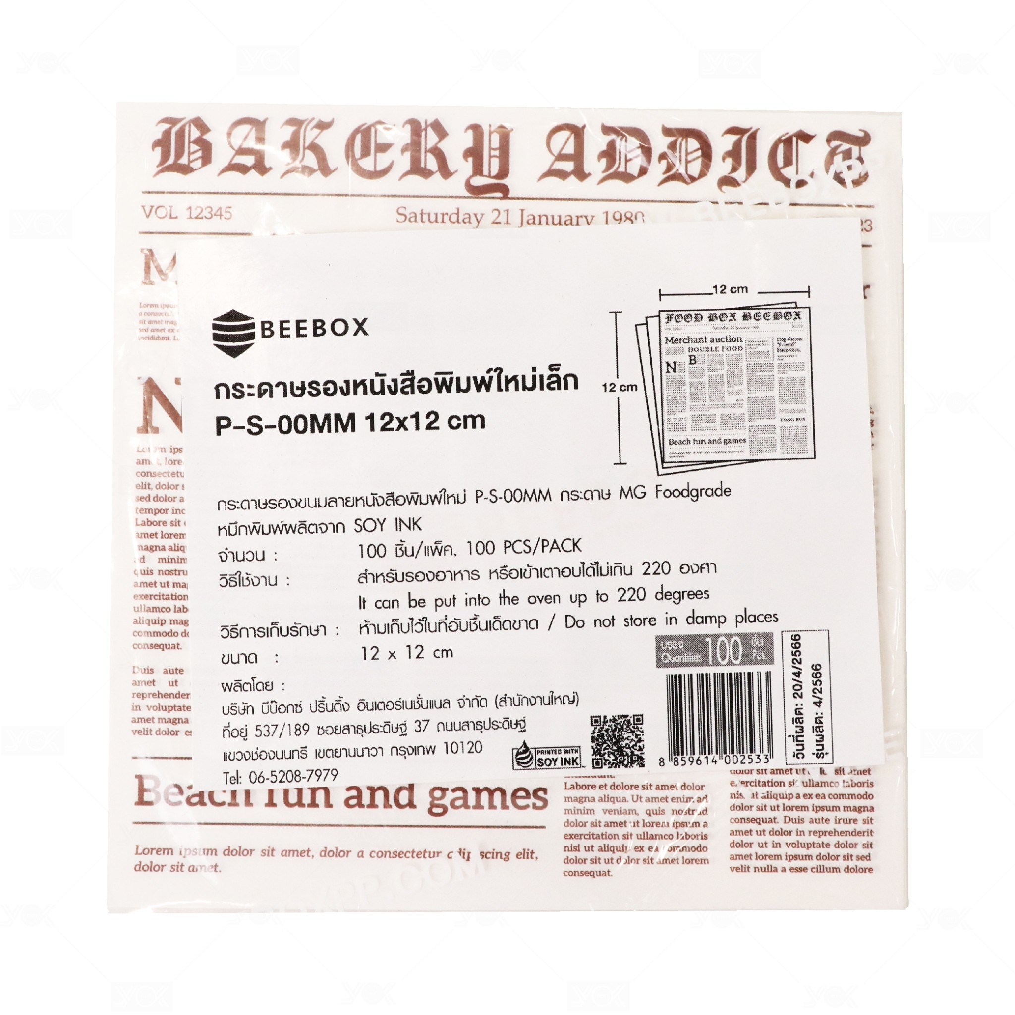 กระดาษรองอาหาร เล็ก BeeBox ลายหนังสือพิมพ์ใหม่ 12x12cm. (100ใบ/แพ็ค)